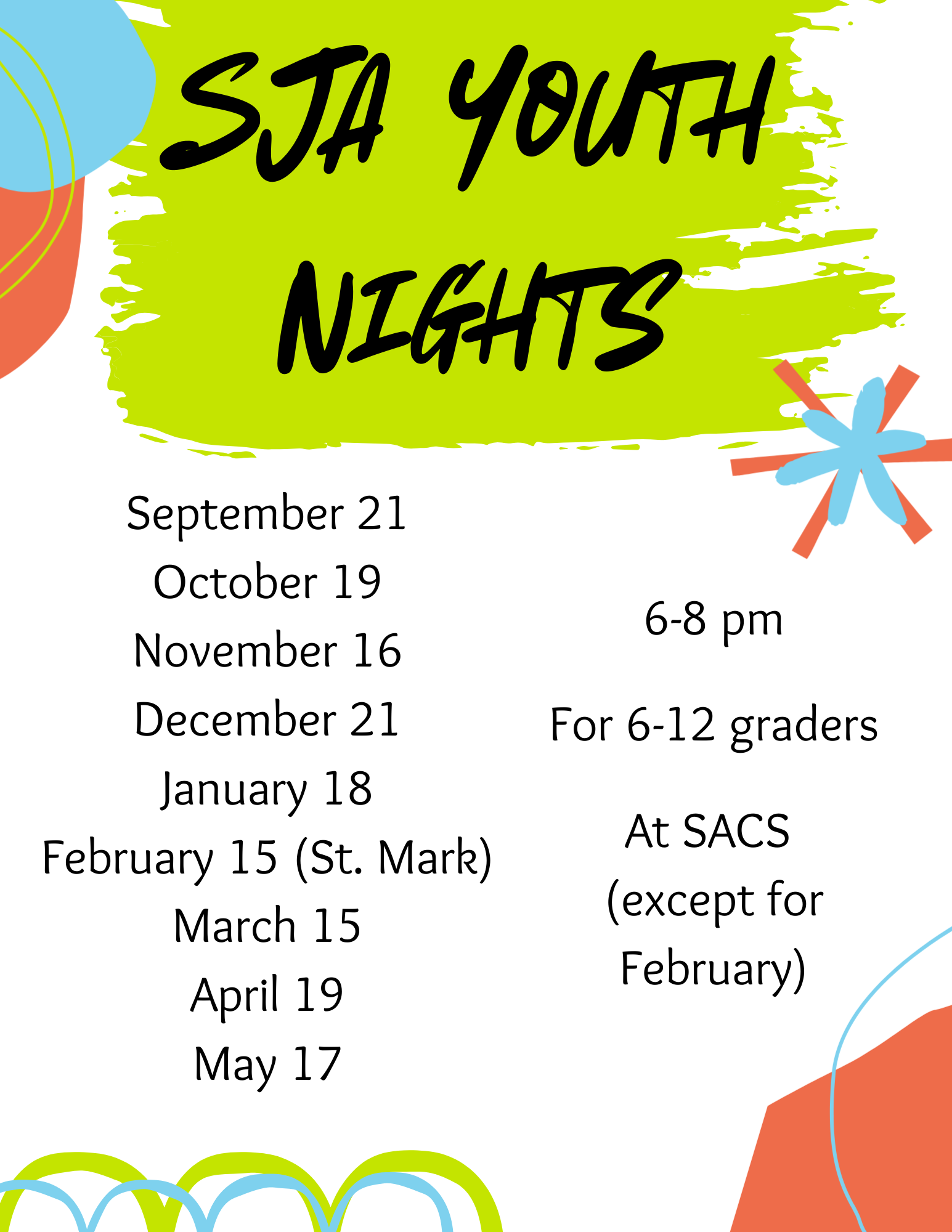SJA is working with NET Ministries to offer a program for our middle school and high school students one Sunday a month from October to May. Our designated NET team will come to SJA to encourage and challenge young Catholics to love Christ and embrace the life of the Church. Youth are encouraged to arrive at 2 pm for an afternoon of prayer, socializing, and faith-building activities, oftentimes filled with laughter and fun! This is followed by our 5 pm Emmaus Mass!